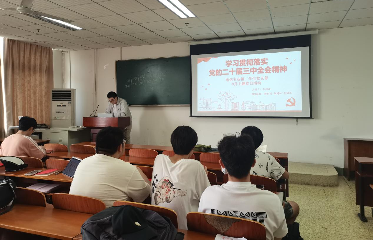 电信专业第二学生党支部于爱特楼401教室开展“学习贯彻落实党的二十届三中全会精神”主题党日活动。本次活动由李润泽同志主讲,全体党员同志参加。