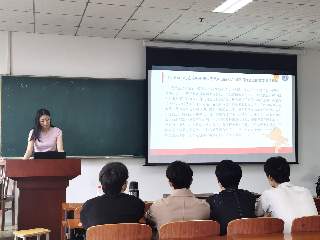 第三小组重点围绕“学习习近平总书记在庆祝中华人民共和国成立74周年招待会上的重要讲话精神”这一题目,从“总结成绩——二十大精神”“宣示信念——一国两制”“瞻望未来——和平发展,互利共赢”的逻辑顺序进行内容的展开阐述,最后总结道:74年来,全体中国人民同心同德、艰苦奋斗,取得令世界刮目相看的伟大成就。今天,有以习近平同志为核心的党中央坚强领导,有中国特色社会主义制度的显著优势,有全党全军全国各族人民的团结奋斗,同志们必将创造新的历史伟业。