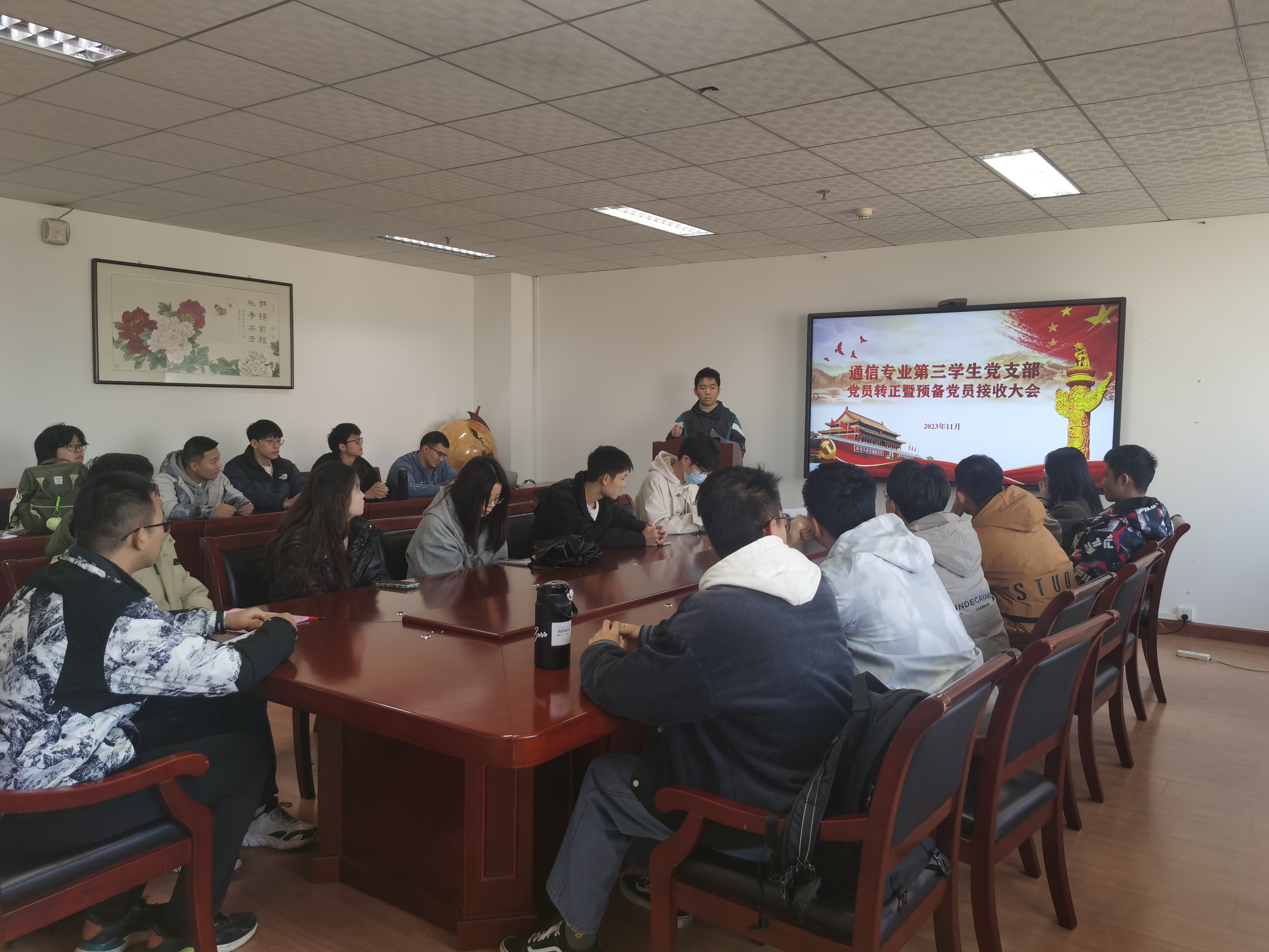 11月26日,通信专业第三学生党支部于鉴主会议室召开预备党员转正大会,讨论杨昊天等6名预备党员转正事项。本次大会由副书记胡临风为同志主持,全体党员同志参会。