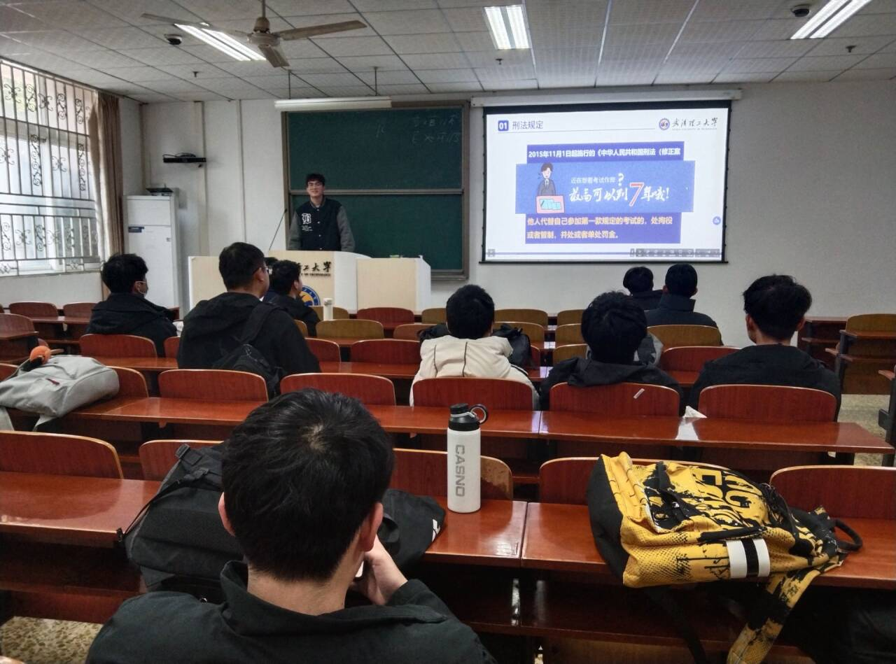 班会伊始,纪守瑜结合学校期末考试工作安排,通过PPT带领大家解读《国家教育考试违规处理办法》《学生考试违纪作弊处分规定》等规章制度,明确考试违纪、作弊的具体情形及相应处分后果。同时,结合近年来高校考试作弊典型案例,纪守瑜向大家展示作弊行为对个人学业、诚信档案及未来发展造成的严重影响,引导同学们认清诚信考试的重要意义。