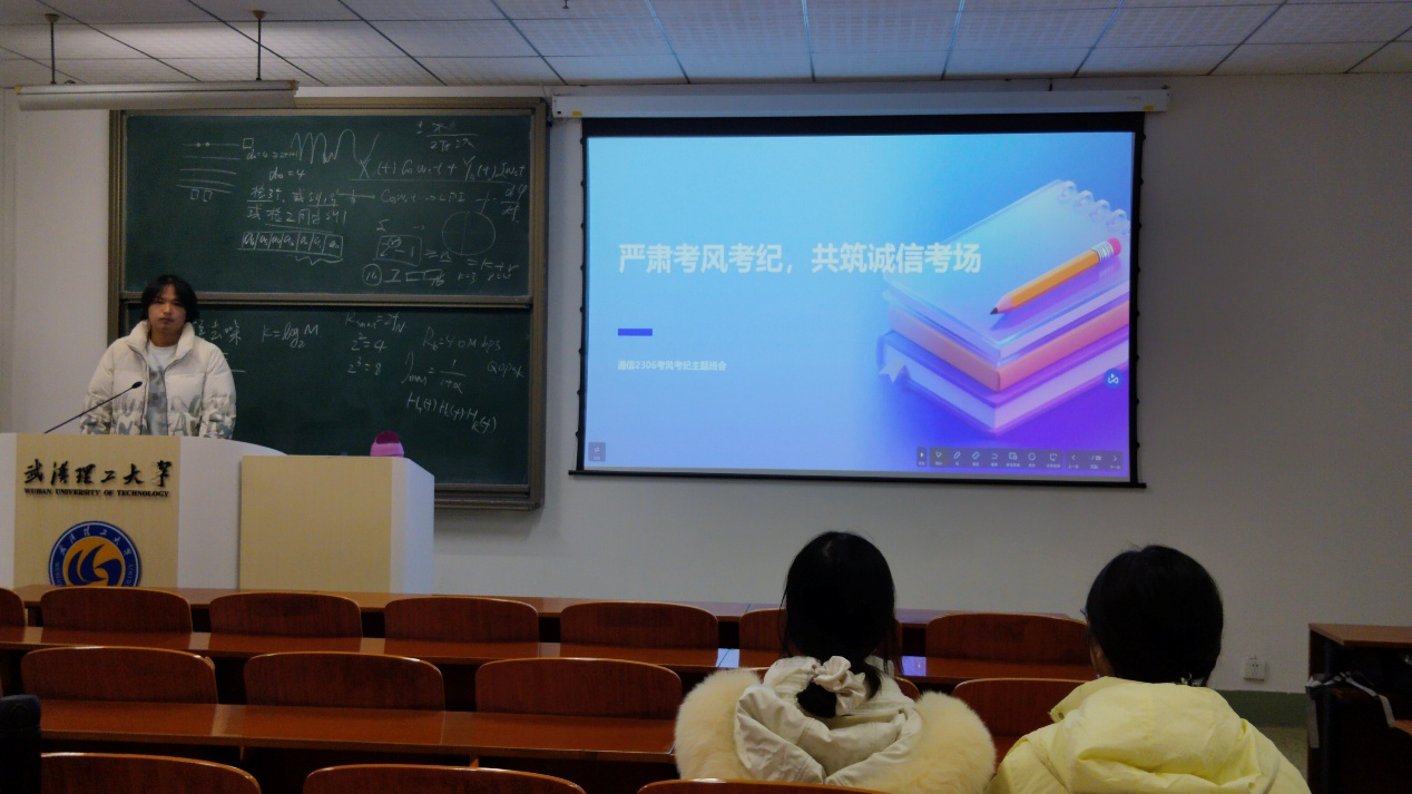 为加强学风建设,弘扬诚信品质,引导学生端正考试态度、严守考场纪律,通信2306于12月9日17时在爱特楼201教室开展“严肃考风考纪,共筑诚信考场”主题班会。本次班会由班长吴炅主持,全班同学共同参加。