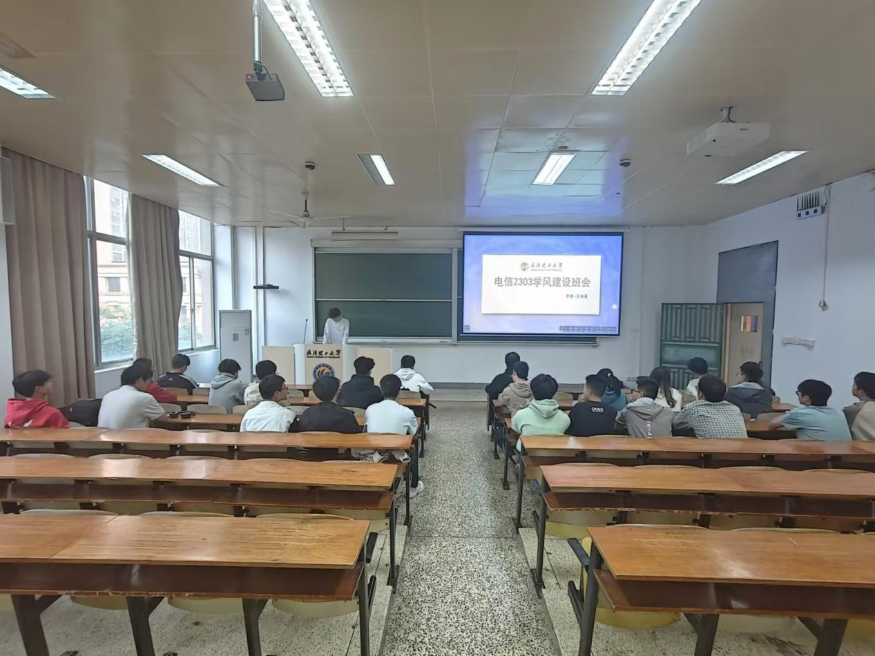 为积极响应学院号召,打造良好的班级学习氛围,电信2303于11月3日下午17:00,在鉴三303教室开展学风建设主题班会。本次班会由学习委员王炜嘉主持,电信2303全体同学参加。