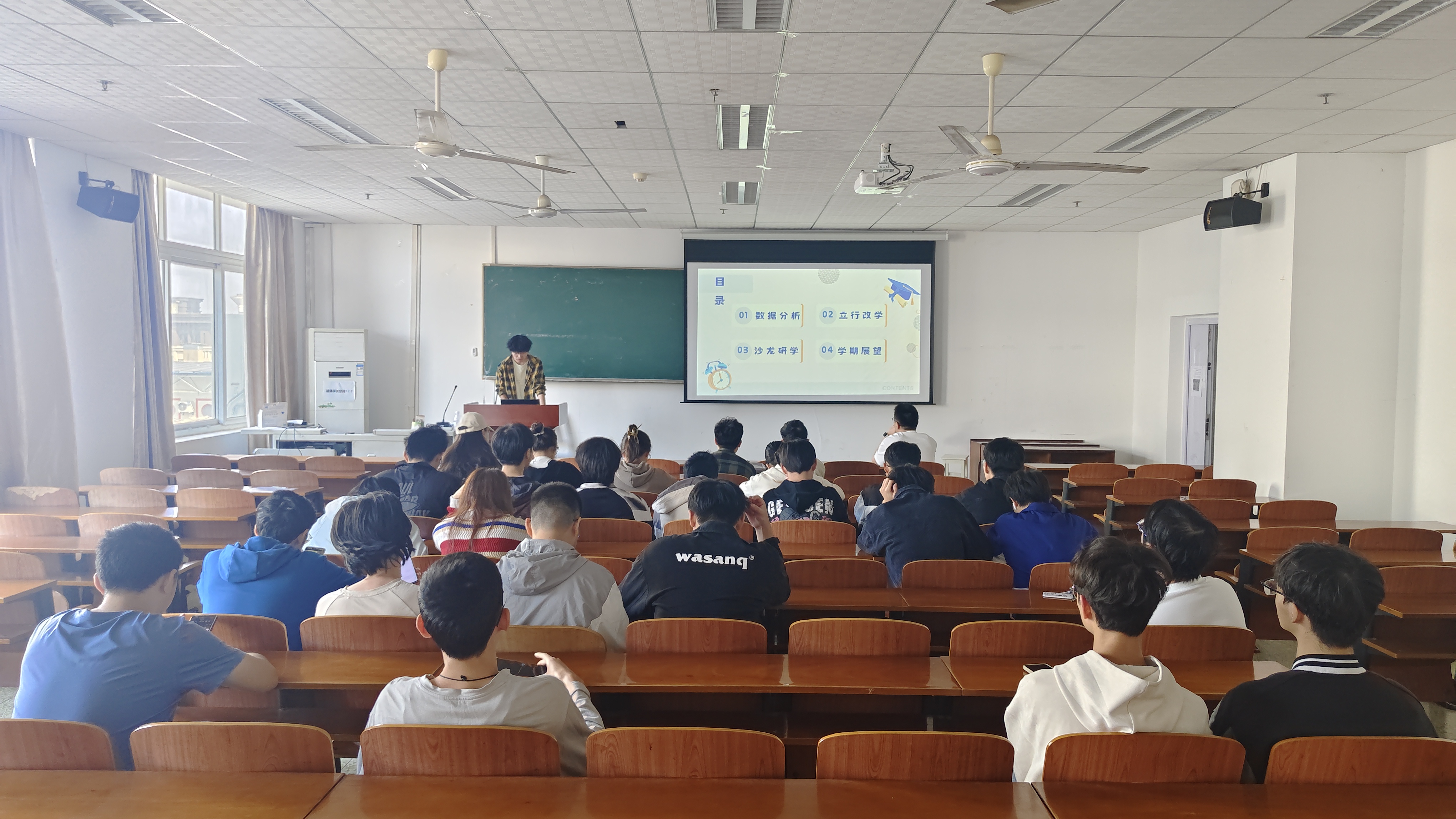 首先由丁虹杰对班级总体学情进行分析,针对同学们的平均学分绩点、核心课程成绩等数据进行了详细的横向与纵向对比,并对班级已取得的成绩如标兵班集体与四级通过率100%表达了赞许。通过对数据的解读,他也希望同学们能够更清晰地评估自己的学业水平,并识别出自身的问题所在。