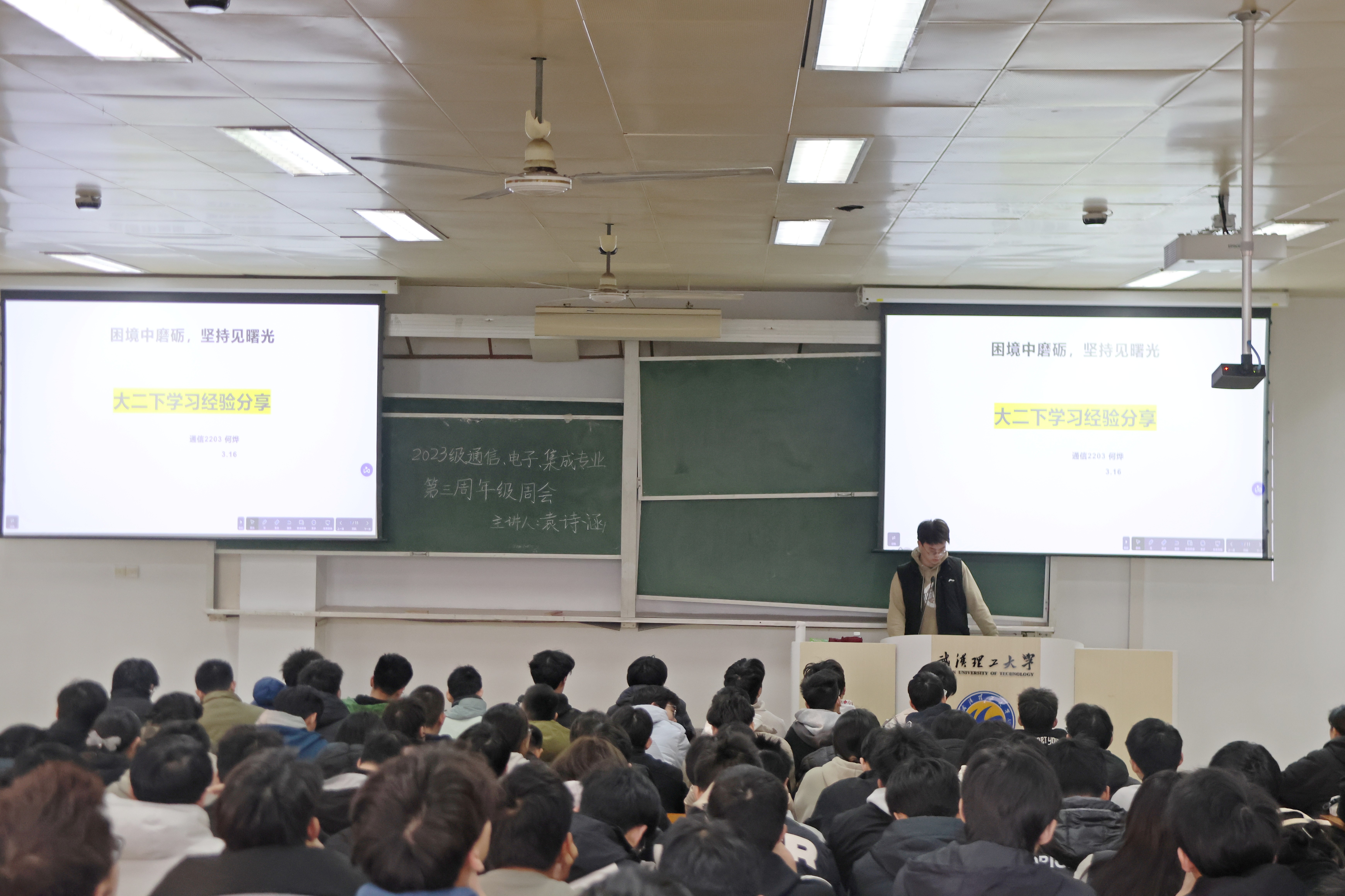 为助力学生提升学业能力,3月16日,学院面向2023级本科生举办了以“笃学力行·朋辈引航”为主题的学习经验分享会。本次活动邀请到通信2203的何烨同学担任主讲嘉宾,他以“困境中磨砺,坚持见曙光”为主题,通过经验分享与互动交流,分享大二专业核心课程学习的经验。