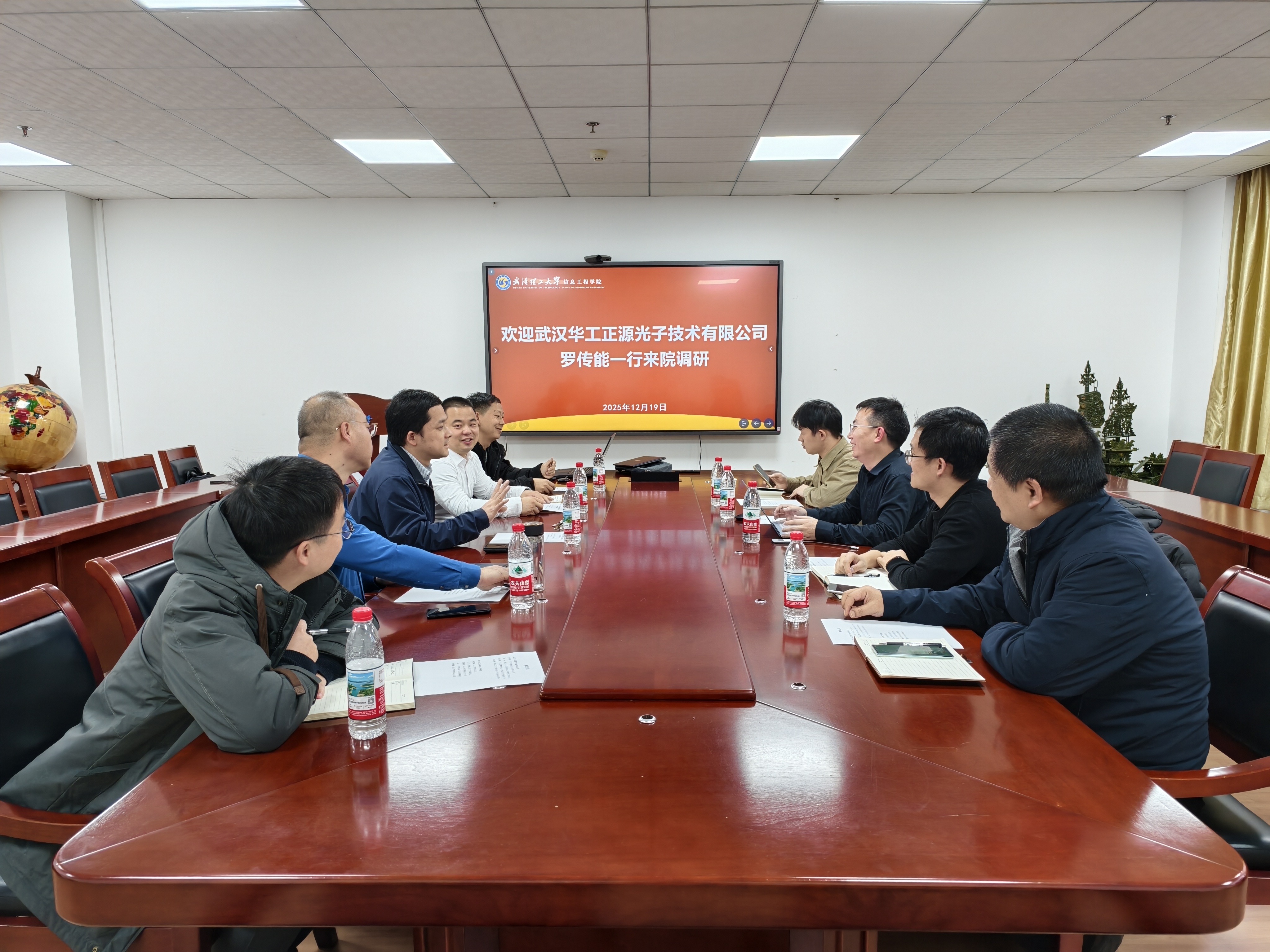 2025年12月19日,武汉华工正源光子技术有限公司CTO、2008级通信工程专业校友罗传能一行前来我院开展交流。这既是一次校企之间的深入交流,也是学子“常回家看看”的一次温暖之旅。学院对此高度重视,副院长方艺霖、党委副书记刘浩杰、副处级组织员苏德亮、副教授马力与刘佳宜共同出席了交流座谈会,与校友畅叙情谊、共谋发展。